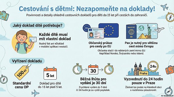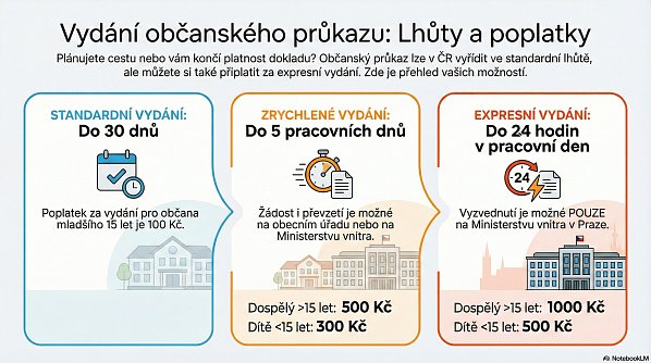 Správní poplatek za vydání občanského průkazu pro dítě do 15 let je 100 korun a doklad platí pět let. Standardní lhůta pro vydání je 30 dní, ale existují i zrychlené varianty. Občanský průkaz je možné vyhotovit do pěti pracovních dnů nebo dokonce do 24 hodin pracovního dne, vždy však za vyšší správní poplatek. Podobně je tomu u cestovních pasů, kde je rovněž možné zvolit zkrácenou lhůtu za výrazně vyšší cenu.